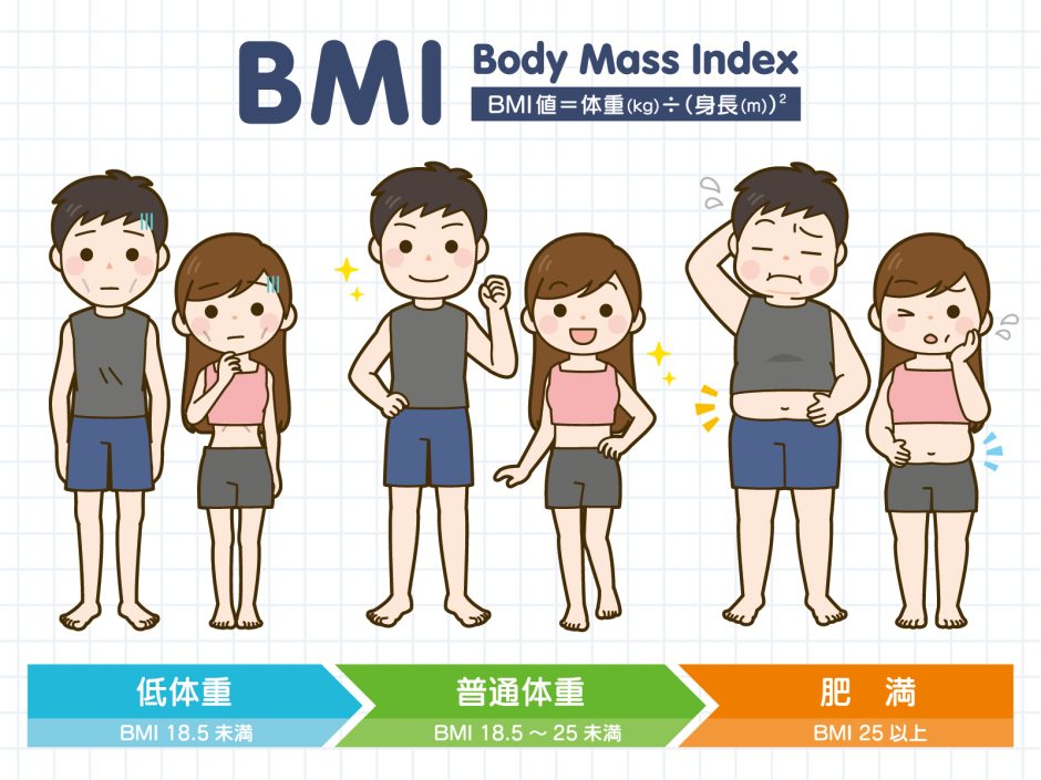 日本肥満学会の基準では、18.5〜25.0未満が「普通体重」とされており、25以上で「肥満」、18.5未満で「低体重」と分類されます。